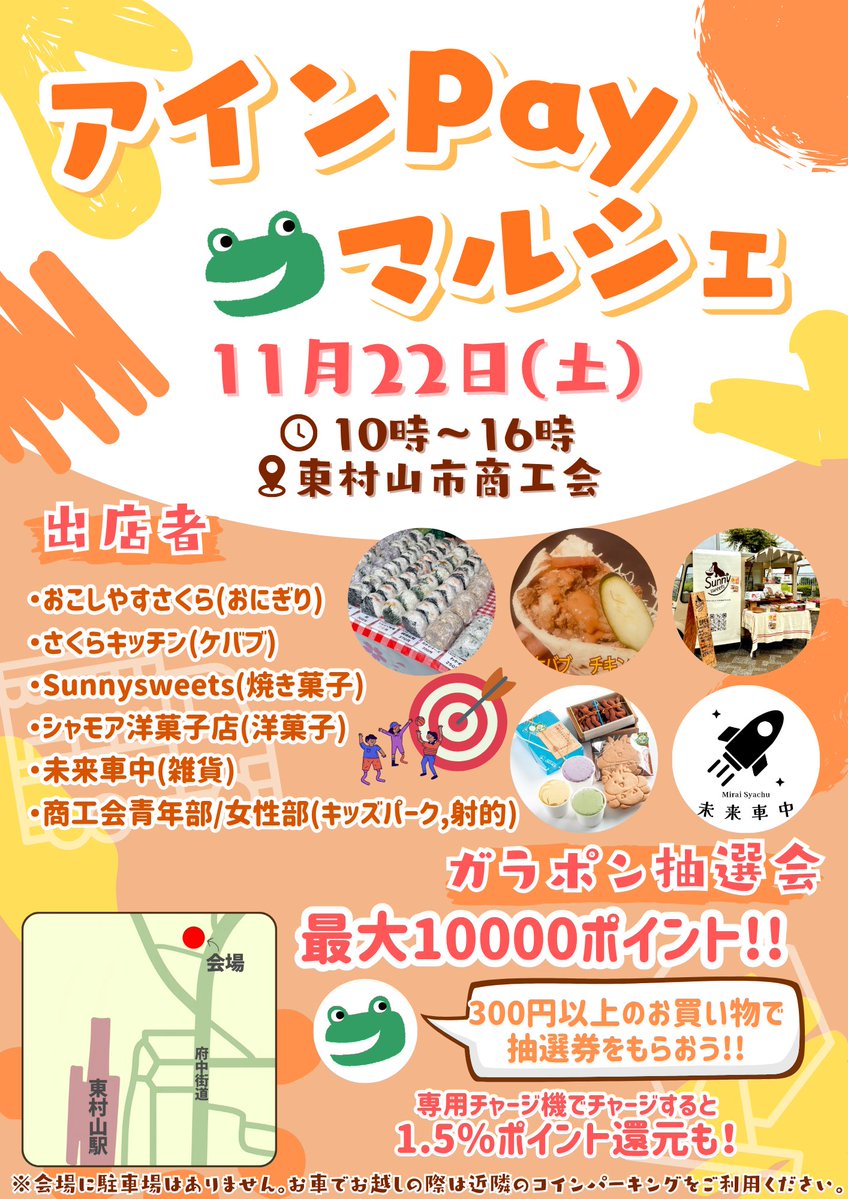 🏮アインPayマルシェ開催!!🐸 東村山市商工会にてアインPayマルシェを開催します! 当日はお馴染み10000ポイントが当たるガラポン抽選会やチ…